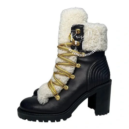 NEW Christian Louboutin Black Leather Shearling Yetita 70 Hiker Booties Lug Sole 40