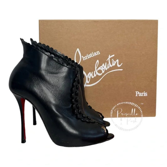 Christian Louboutin Deguise 100 Scalloped Leather Peep-toe Booties In Black 39