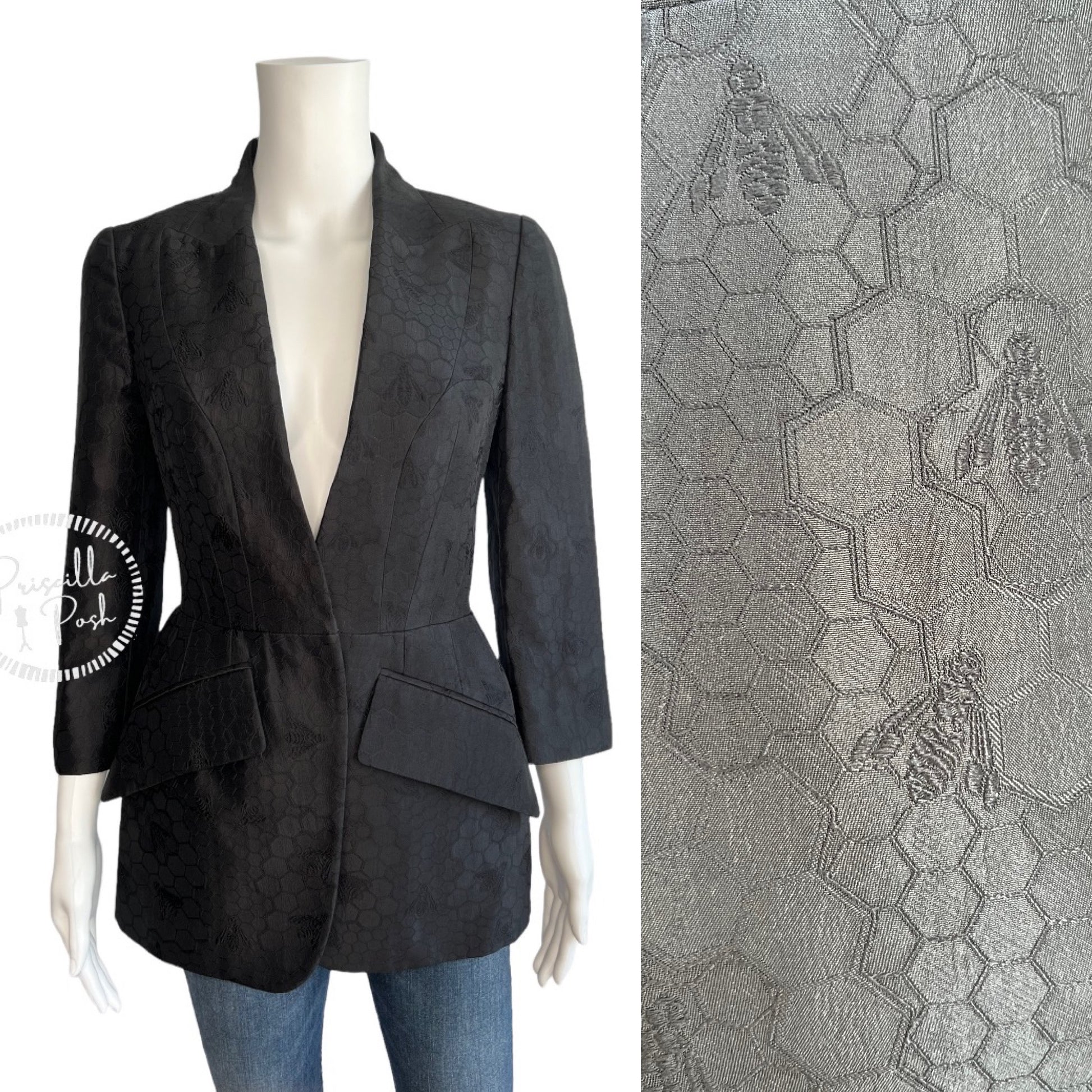 Alexander McQueen bee and honeycomb patterned black jacquard silk blazer.