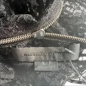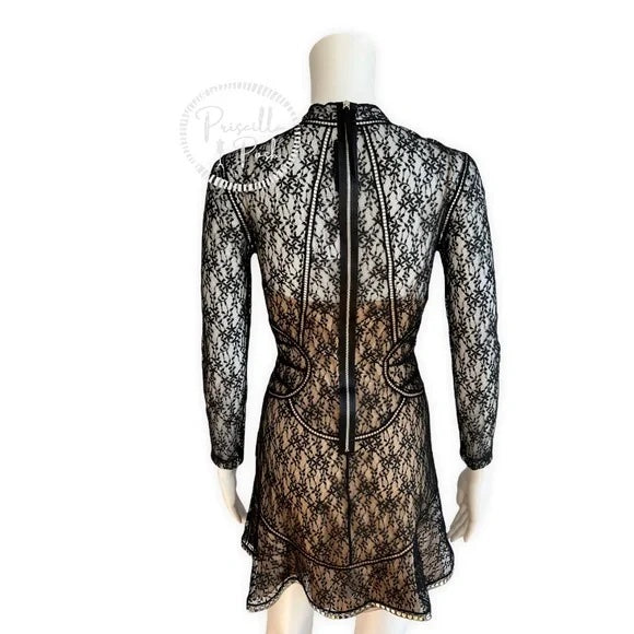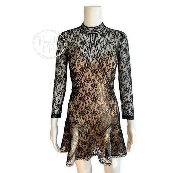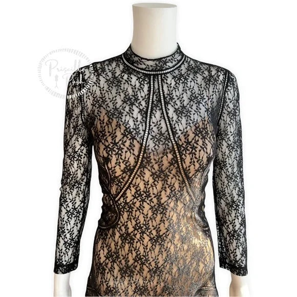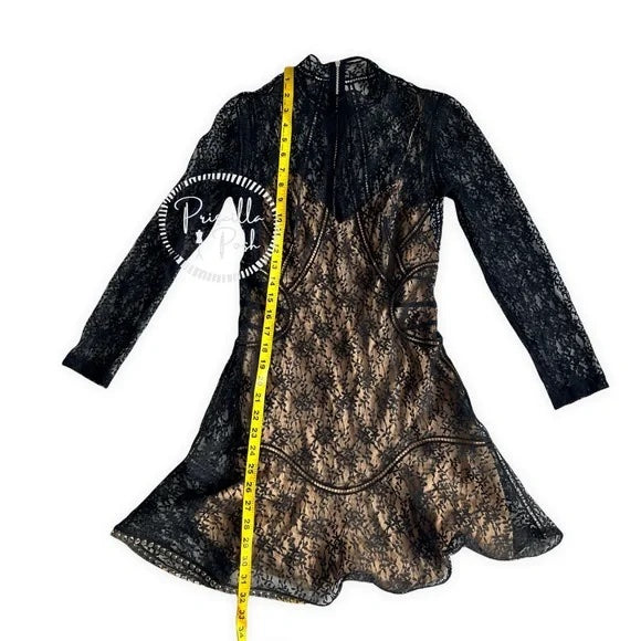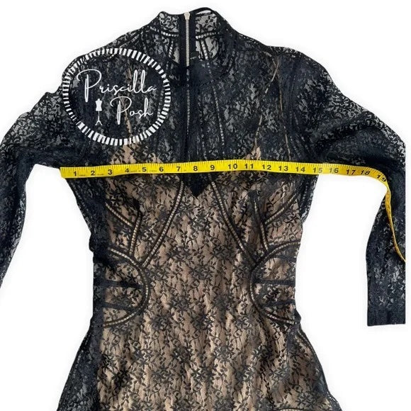 Alexander Wang Long Sleeve Contoured Mini Dress in Black Lace Sheer Nude Slip