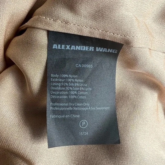 Self: 100% nylon, Contrast Fabric: 100% cotton, Lining: 92% silk 8% lycra. Made in China. Dry clean only. Fully lined. Lace knit fabric. Back zipper closure. Silver stud trim.