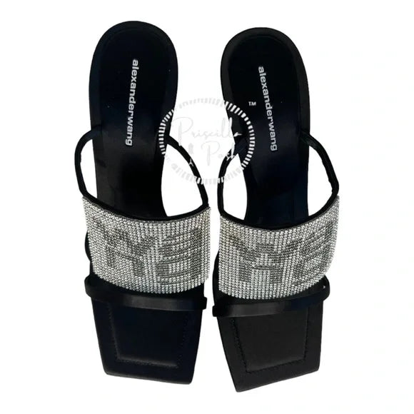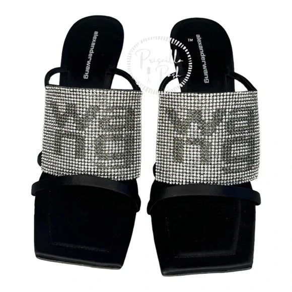 BRAND NEW! Alexander Wang Julie High Heel Slides Rhinestone Logo Heels Square 38.5