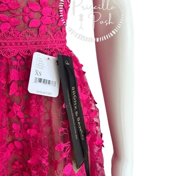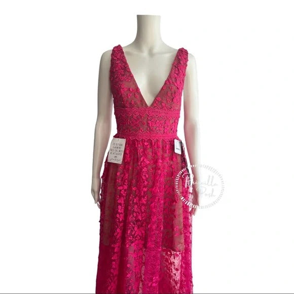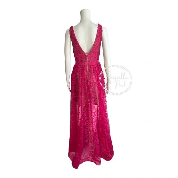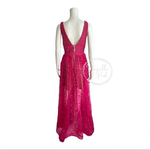 Bronx & Banco Megan Fuchsia Maxi Dress Gown Floral V Neck Flower Appliqué