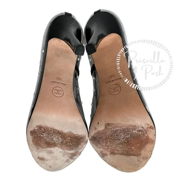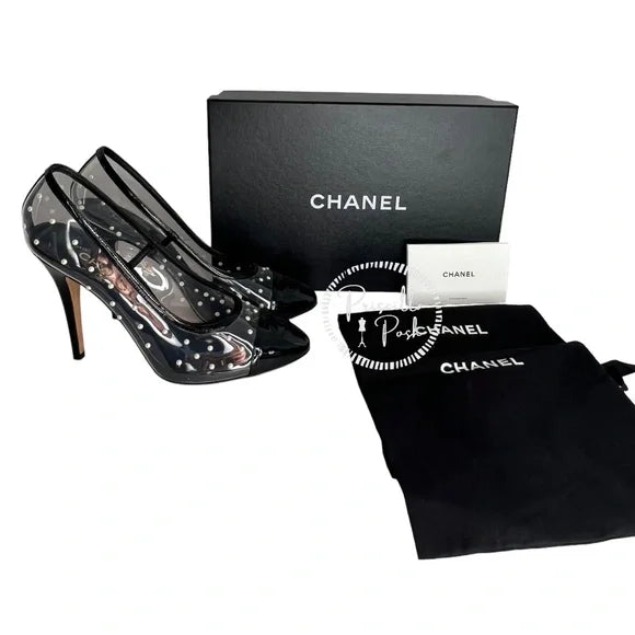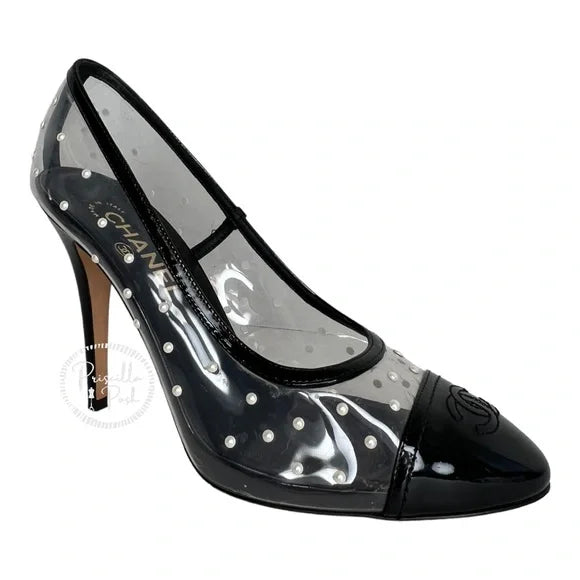 Chanel Black Patent Pvc Clear Transparent CC Pearl Sandal Stiletto Heel Pumps Size 40