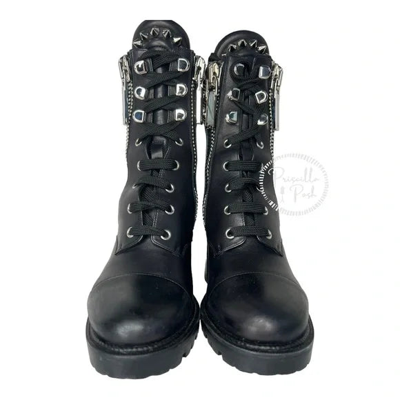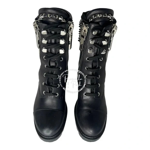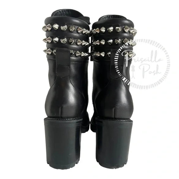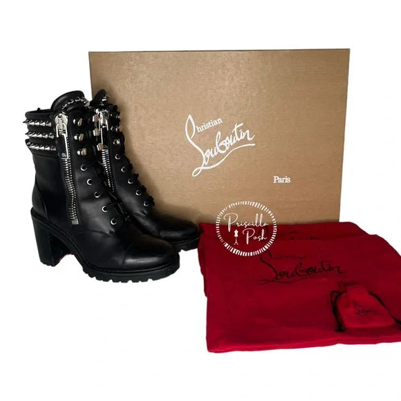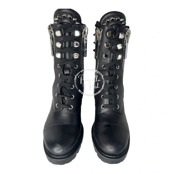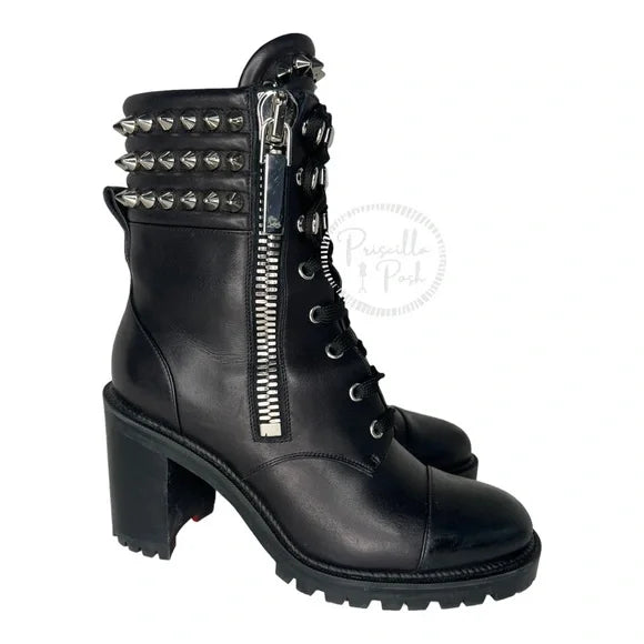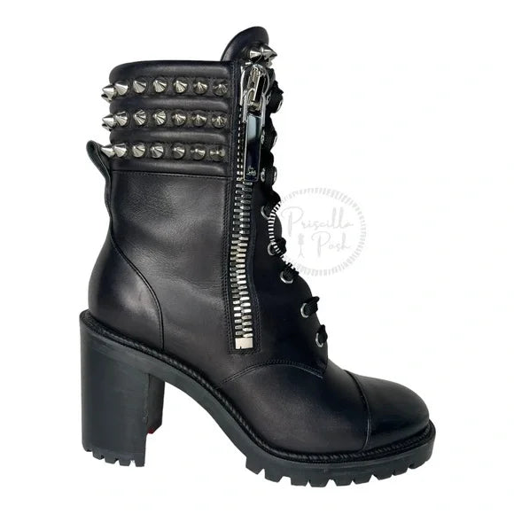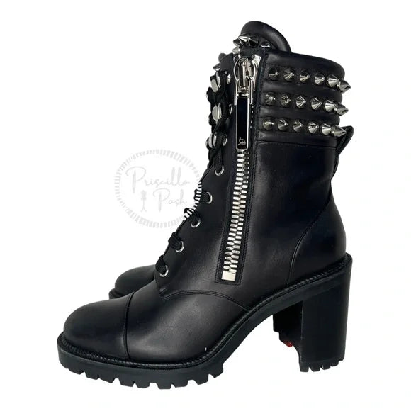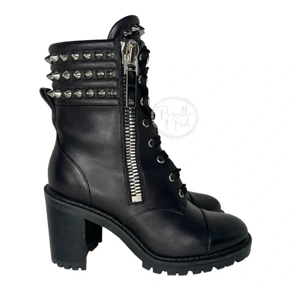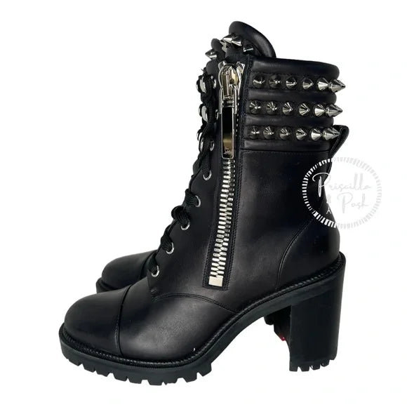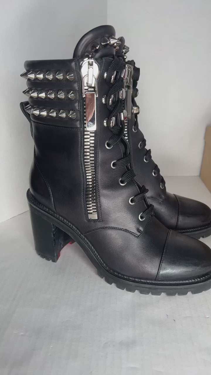 Christian Louboutin Black Leather Block Heel Silver Spike Combat Boots 37.5