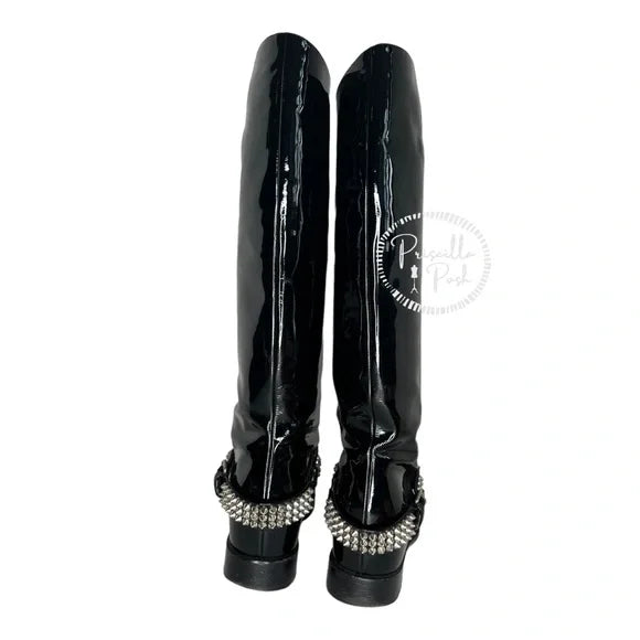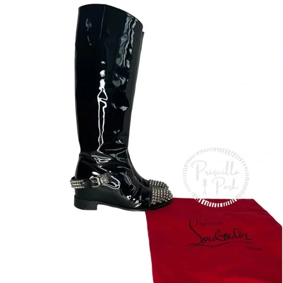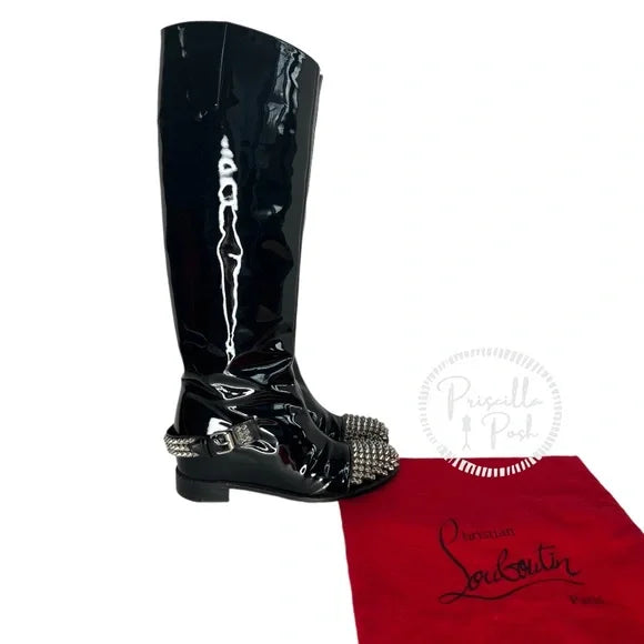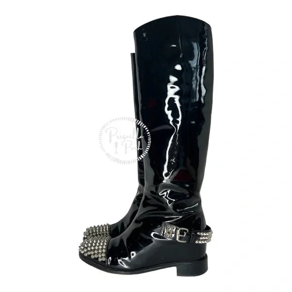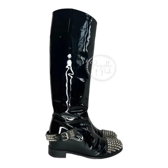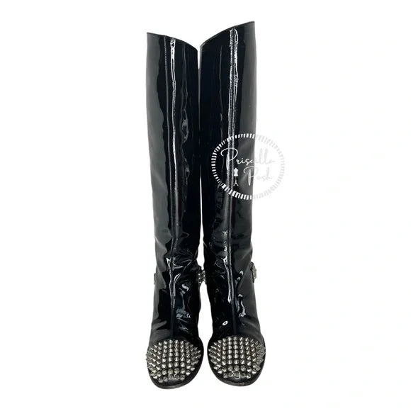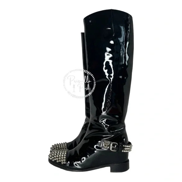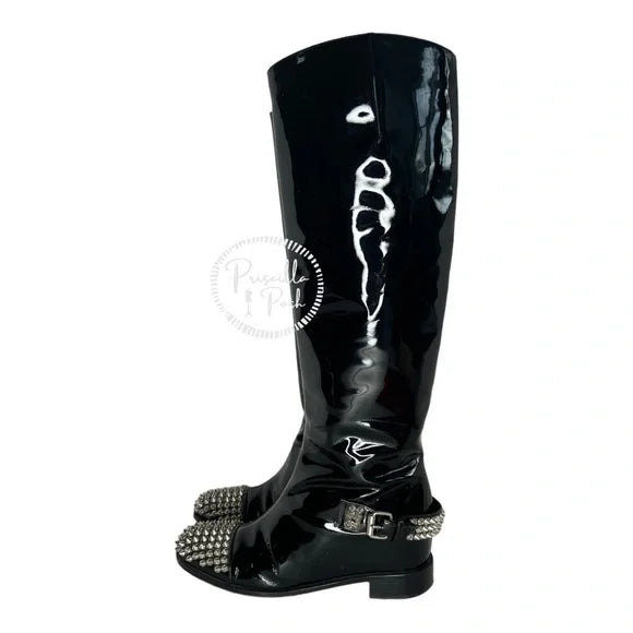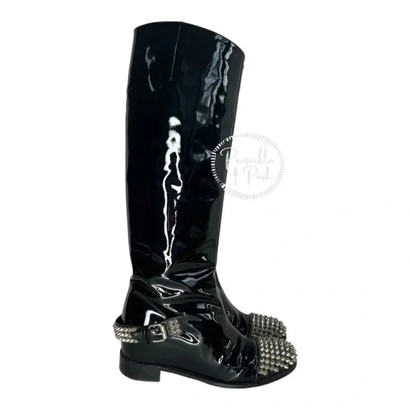 Christian Louboutin Black Patent Leather Knee High Silver Spike Boots