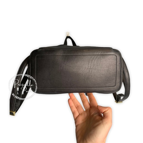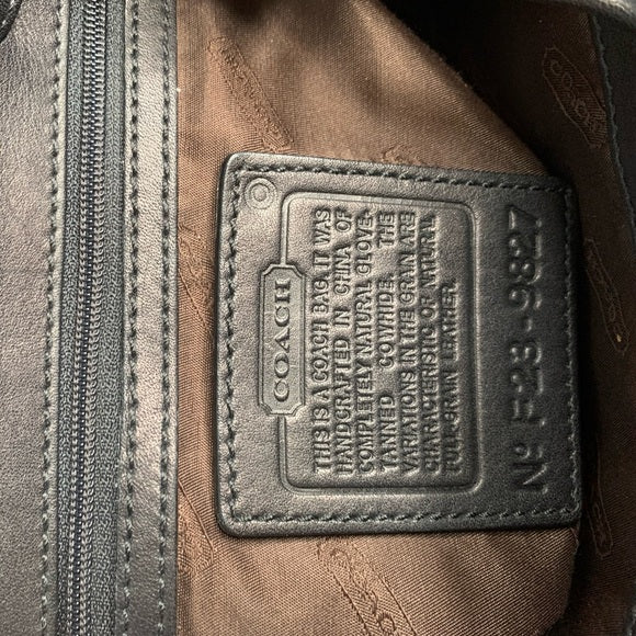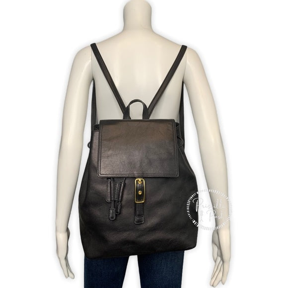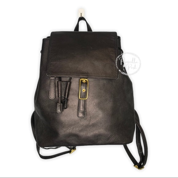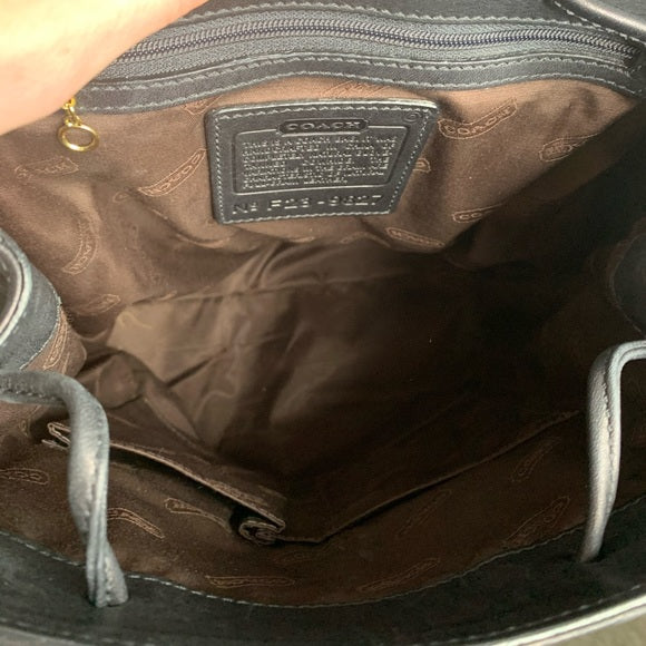 Flap over the front with a buckle and magnetic snap, a drawstring around the top, lined main compartment with a cell phone and misc. pocket and a zipper pocket inside serial #F23-9827
