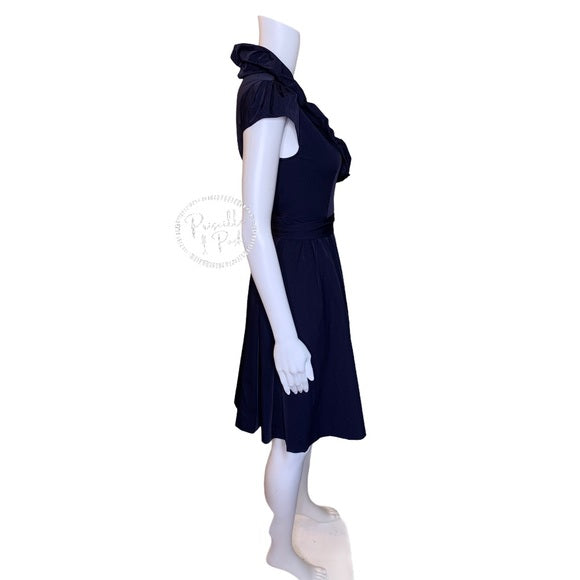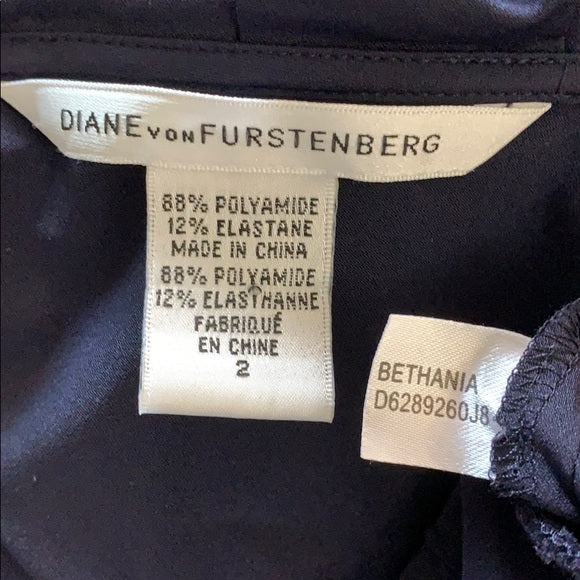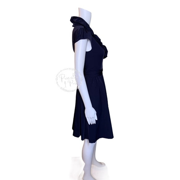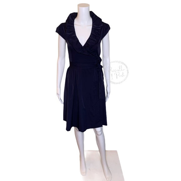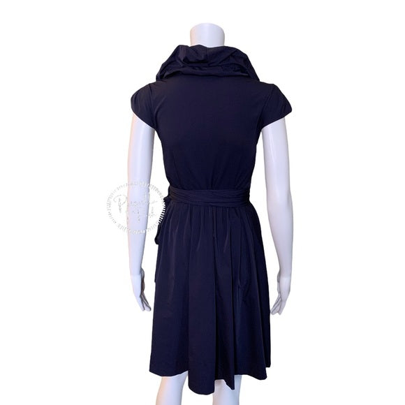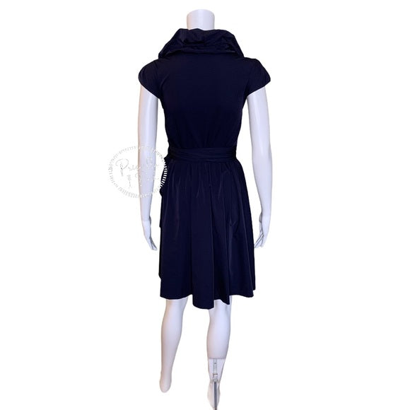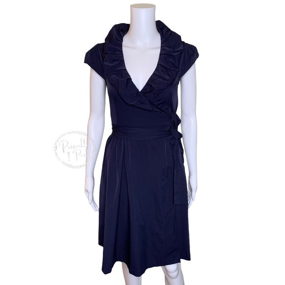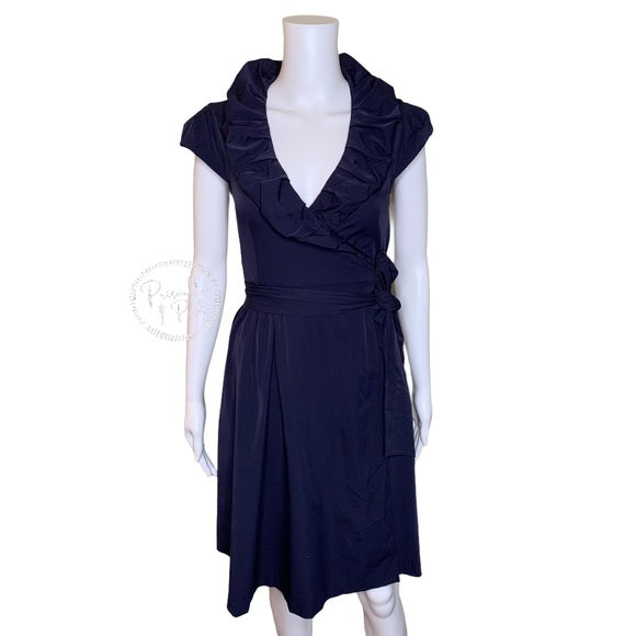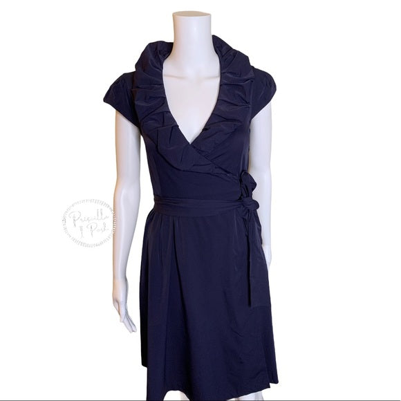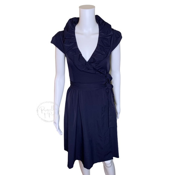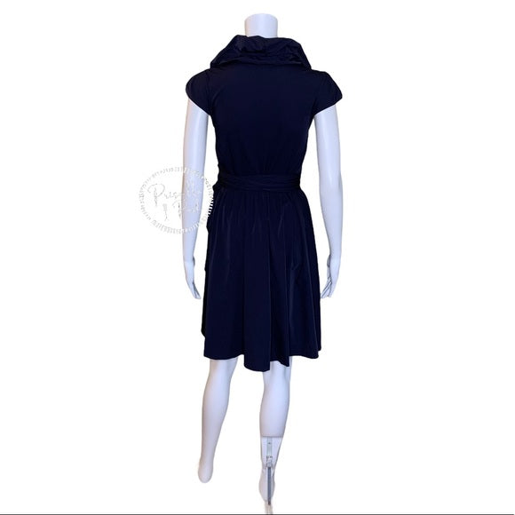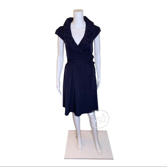 This Amazing, Feminine DVF Bethania is stunning and features an oversized Ruffled bubble collar, cap puffed sleeve, wrap style, in seam pockets in a gorgeous navy polyamide/elastane blend.