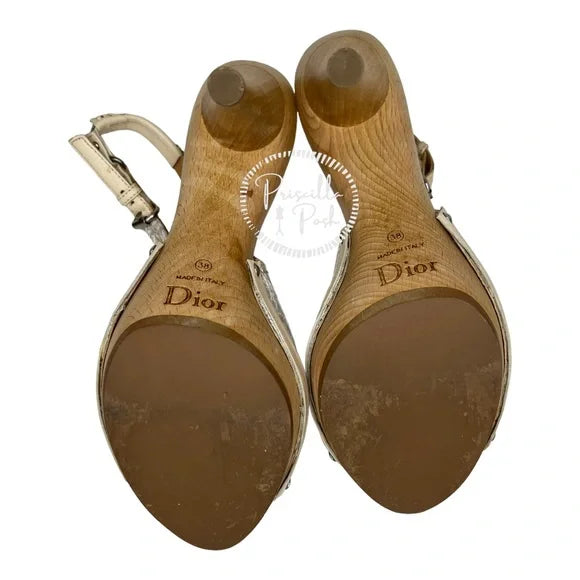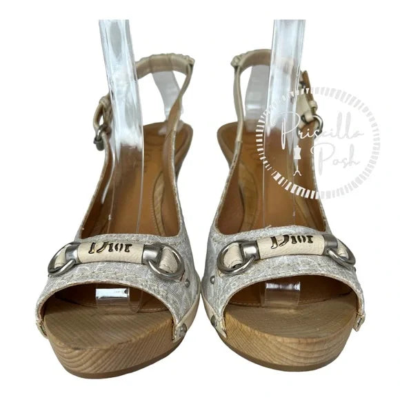 Dior Horsebit Logo Platform Sling Back Open Toe Sandals 38 Canvas Gold