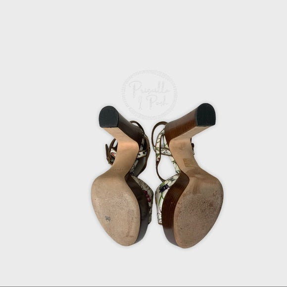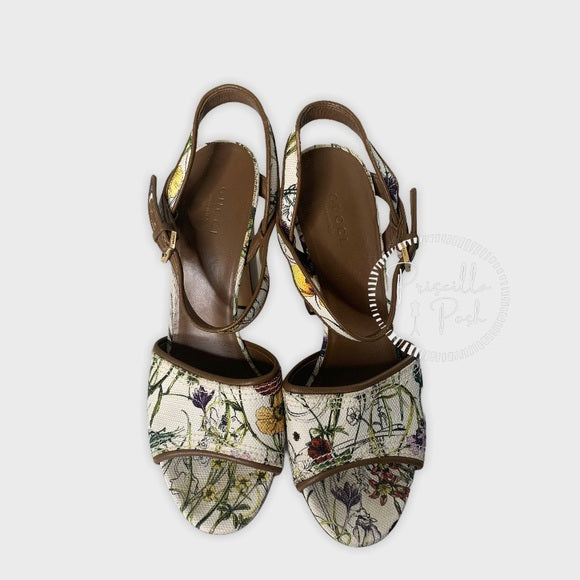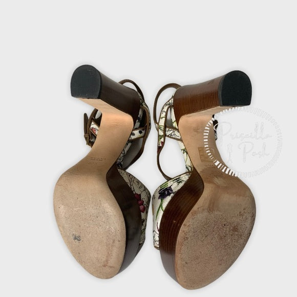 The Gucci Danielle sandal takes you through the height of spring in floral-print canvas and a prominent platform. Mini infinity flora canvas upper; smooth leather trim.