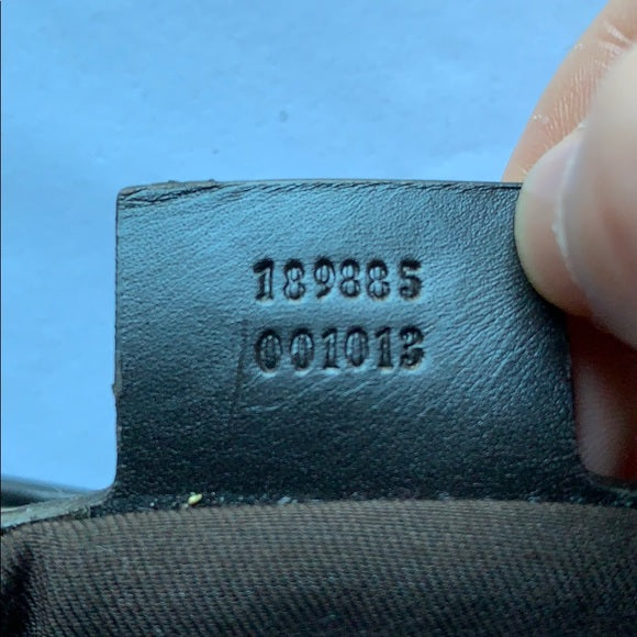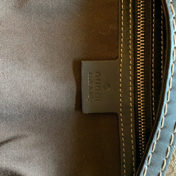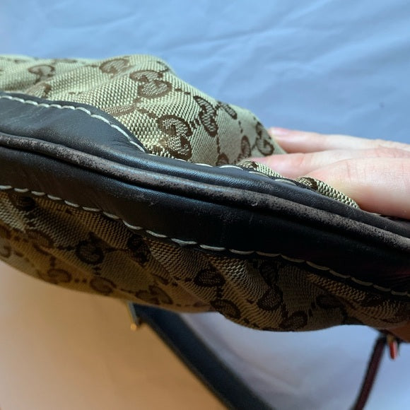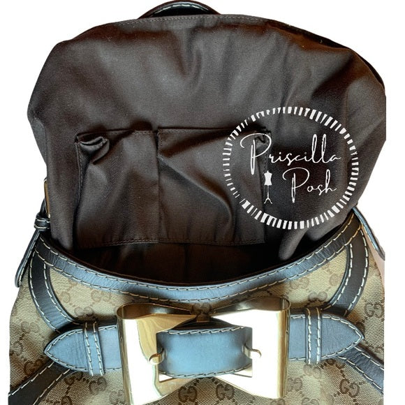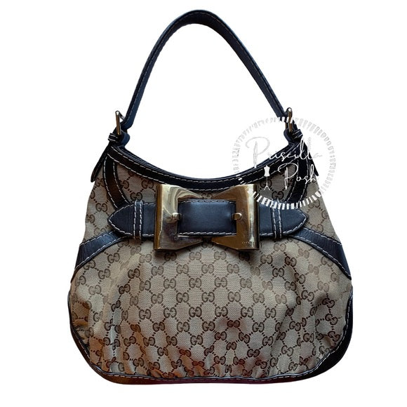 This bag has a beautiful gold tone bow buckle in front. It has a classic hobo shape and its exterior is GG Guccissimma canvas and trimmed in leather and has a shoulder strap with adjustable buckles.
