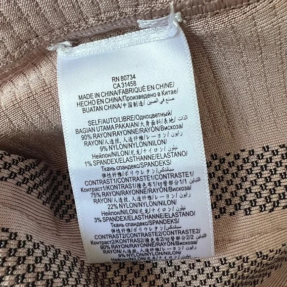 Black and pink champagne bandage evening dress with textured pattern throughout, V-neckline and concealed zip featuring hook-and-eye closure at V-back.