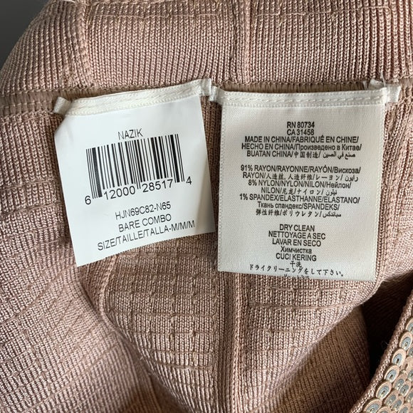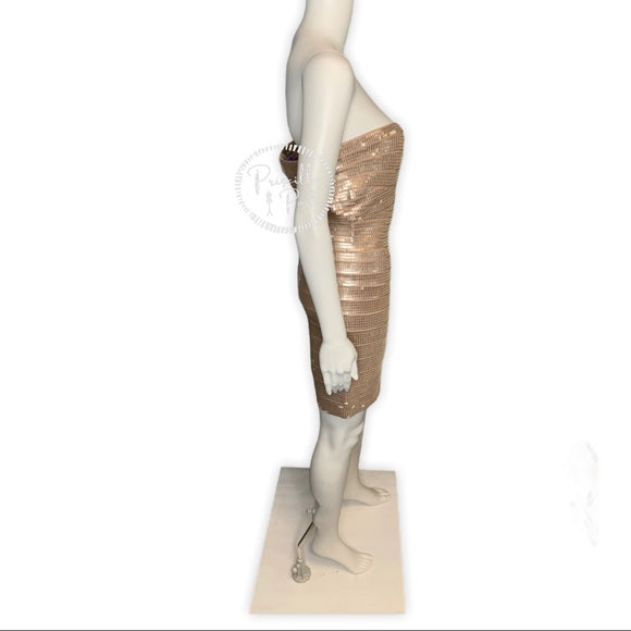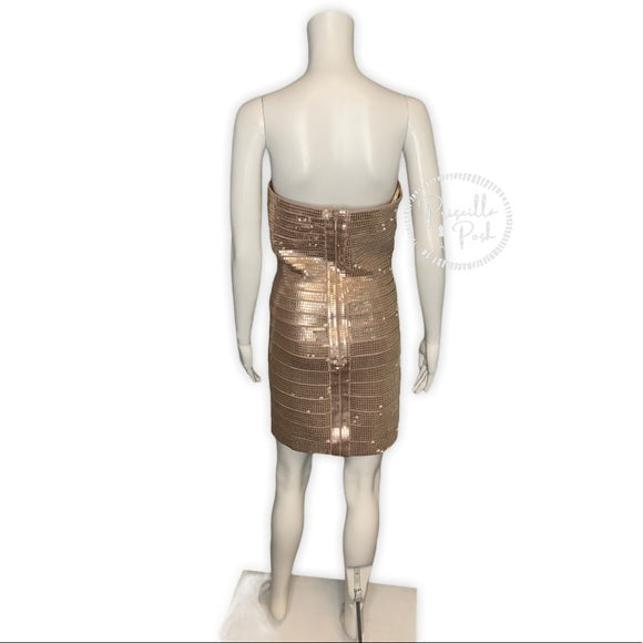 Blush Pink / Nude Faux-leather paillettes and metallic sequins coat this sexy Herve Leger mini dress in a glamorous, shimmering texture. Crossover banding defines the sweetheart neckline, and boning sculpts the slim bodice.