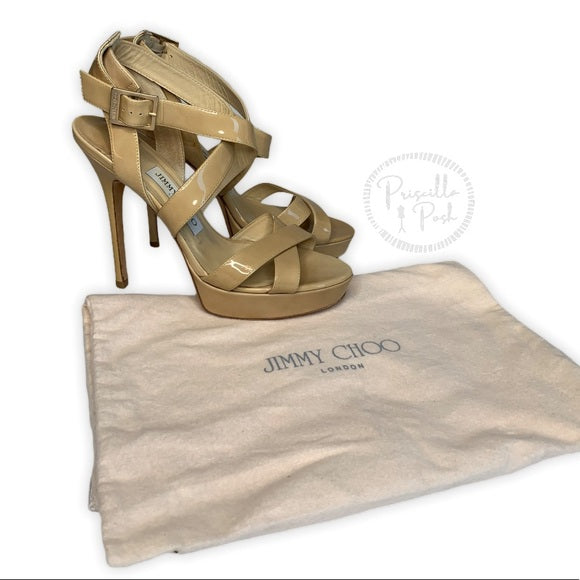 Jimmy Choo Nude Patent Louisa Crisscross Platform Sandals