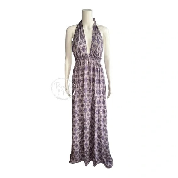 Loveshackfancy Purple Print Halter Neck 100% Silk Maxi Dress