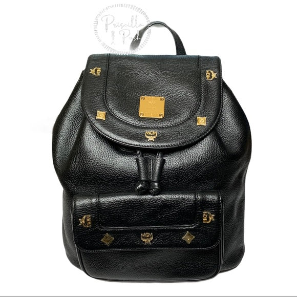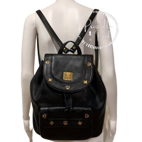 MCM Large Vintage Black Leather Gold Logo Studded Backpack