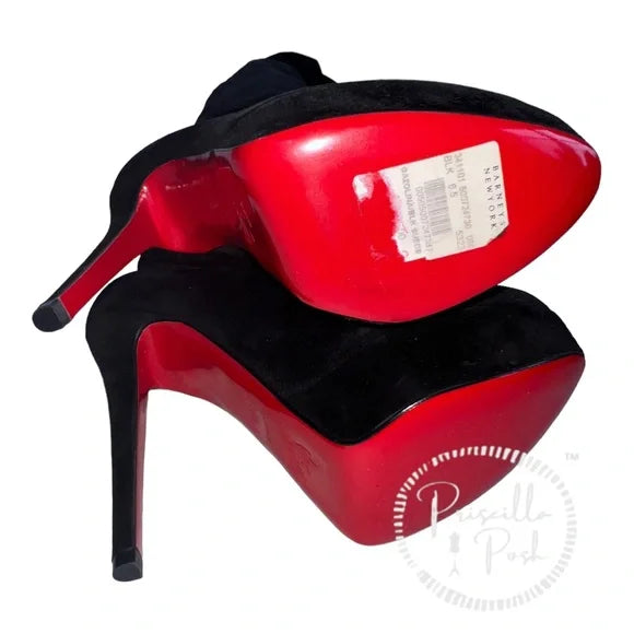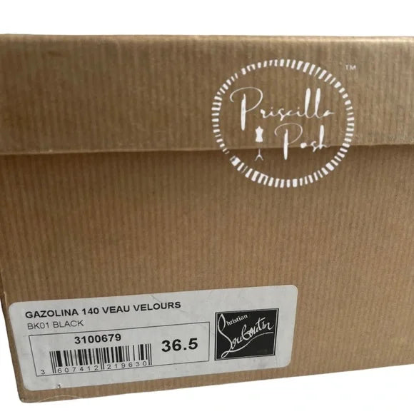 Self-covered heel, 5½" (140mm) hidden platform, 1½" (40mm) compares to a 4" heel (100mm) shaft, 15½" inside zip closure, padded insole, signature red leather sole, made in italy. Color: black