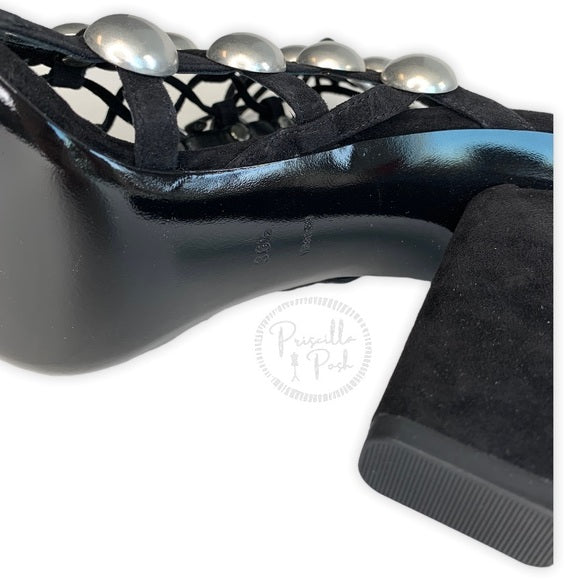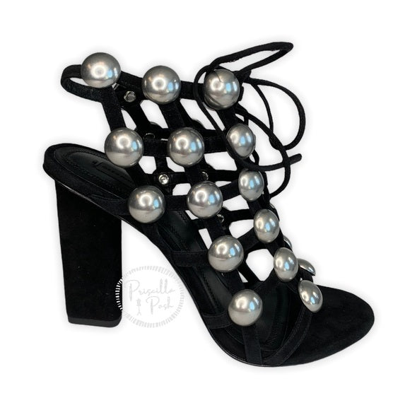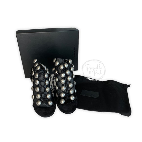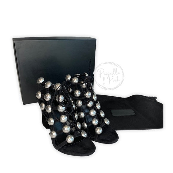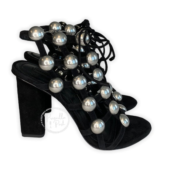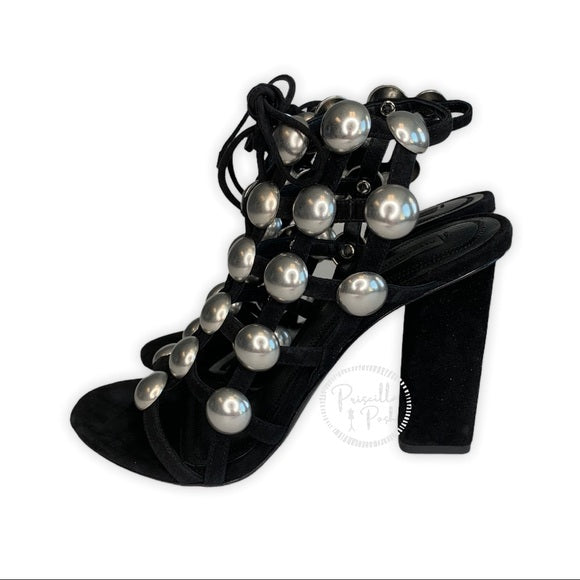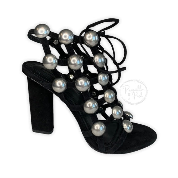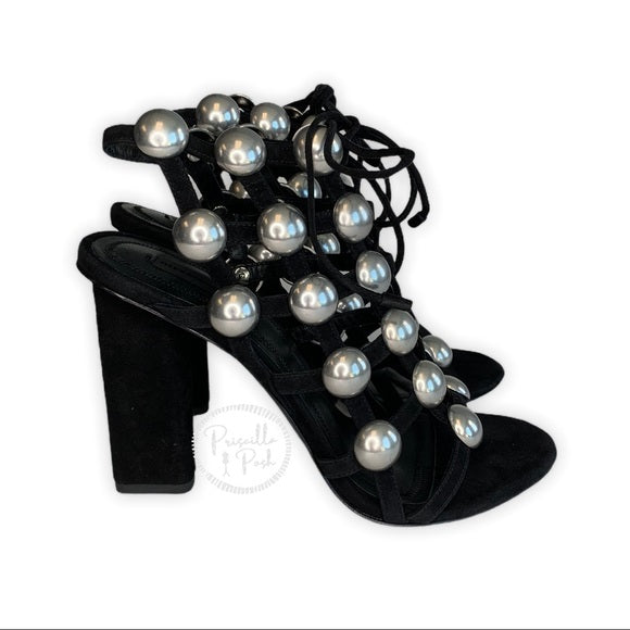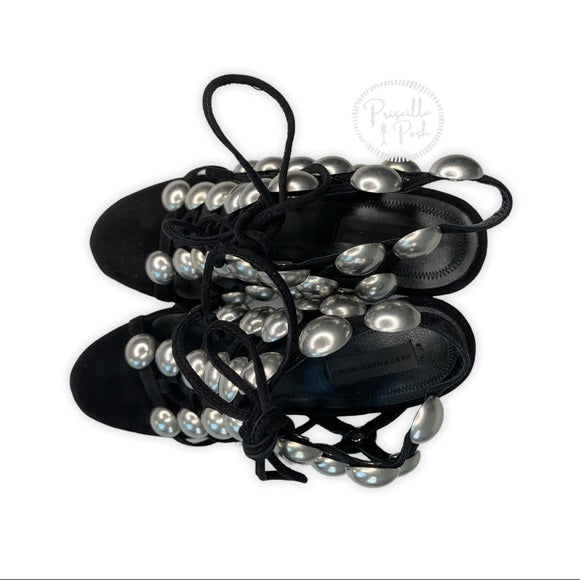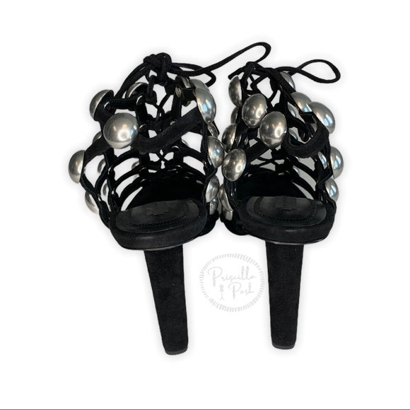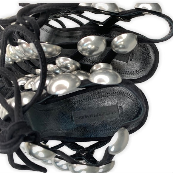 Make a statement this season wearing these black suede and leather Rubie sandals from Alexander Wang featuring a gladiator cage design, a slingback strap, rounded stud embellishments, an open toe, a lace-up front fastening and a block heel. Gleaming dome studs bring eye-catching dimension, while slender ghillie-inspired laces add a pretty flourish to the cage silhouette of a chic sandal