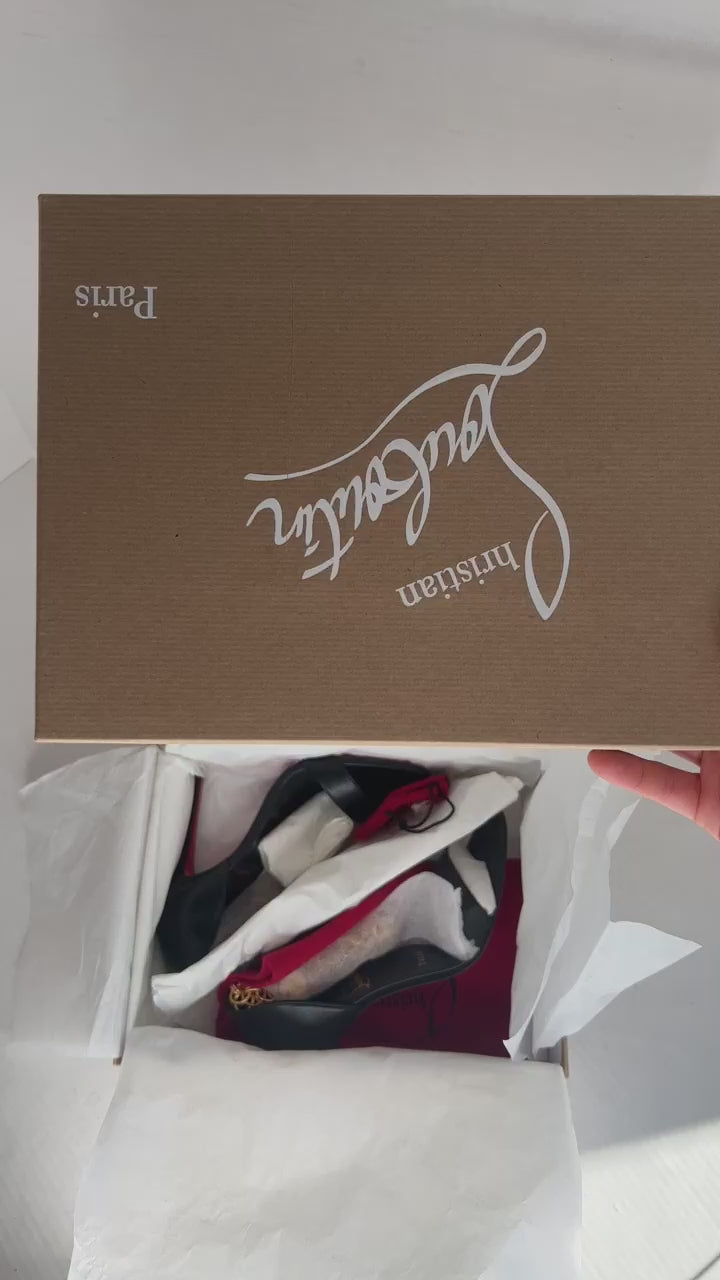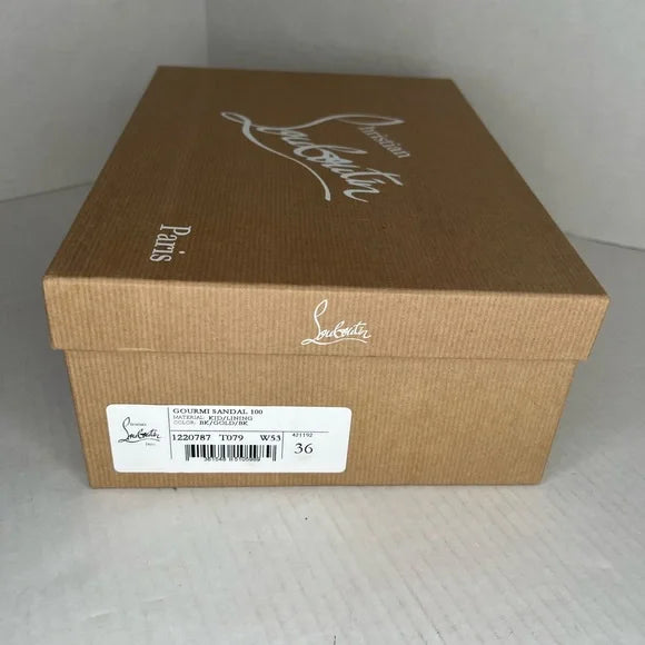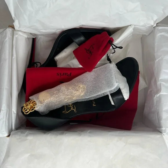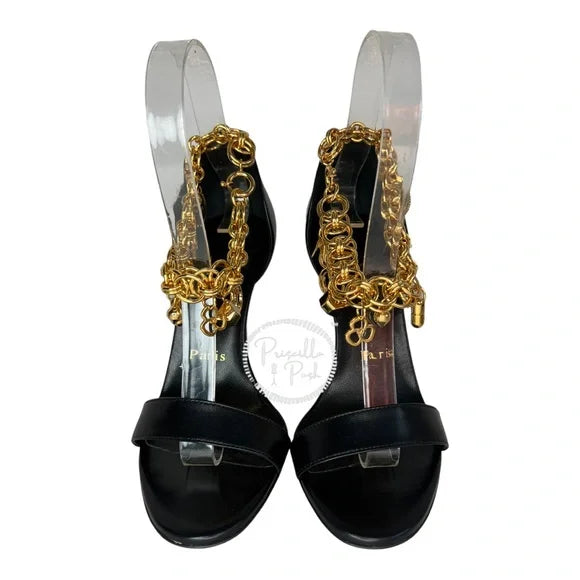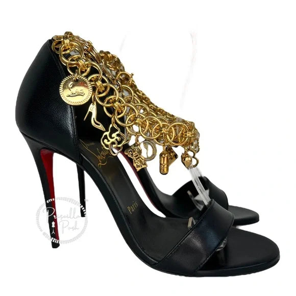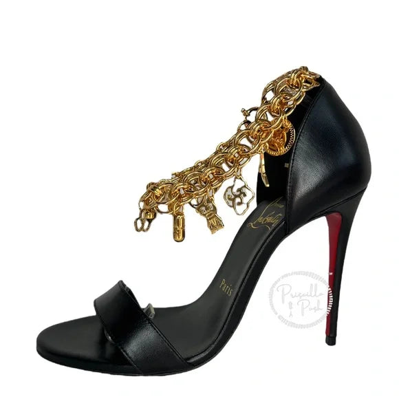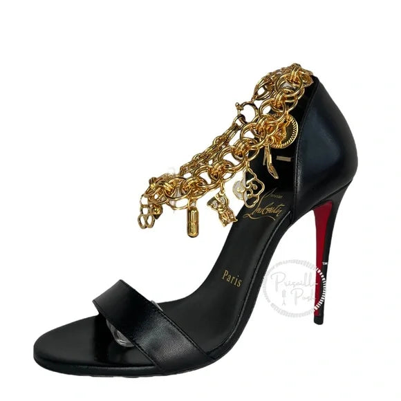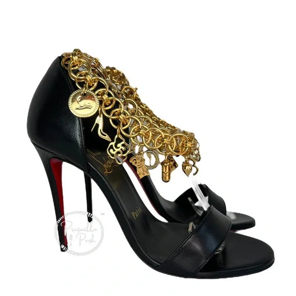 NWB Christian Louboutin Black Leather Open Toe Gold Charm Ankle Strap Sandals 36