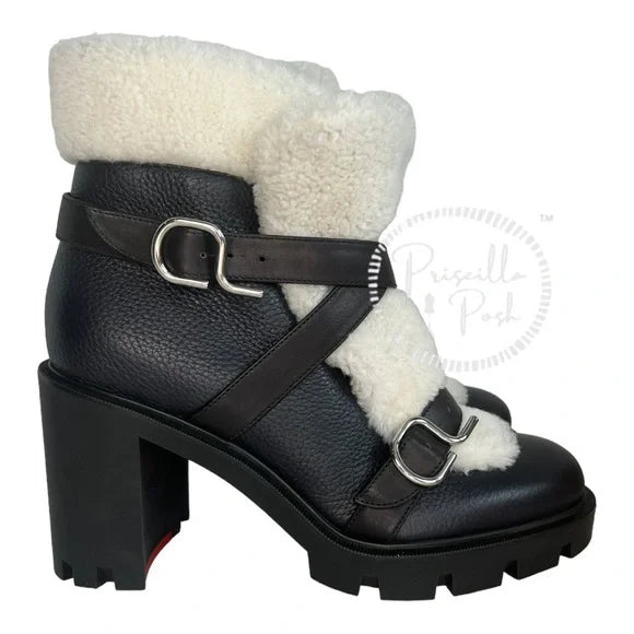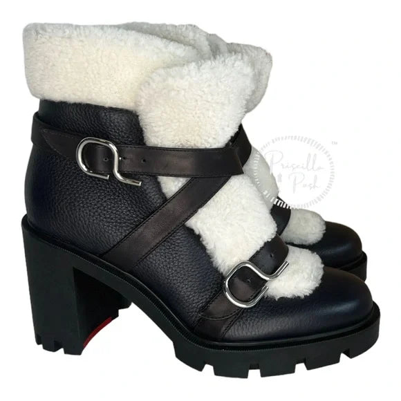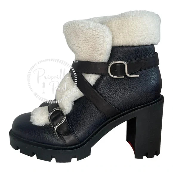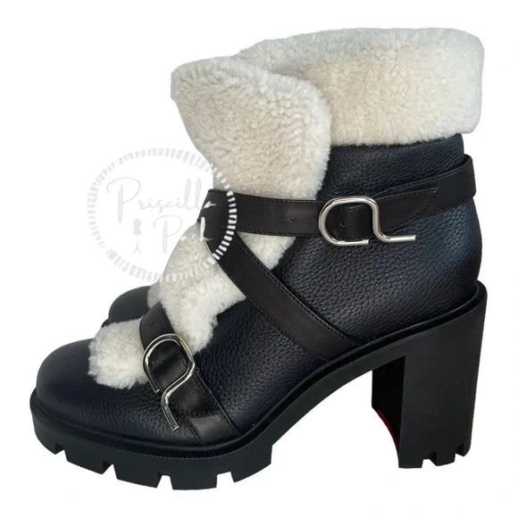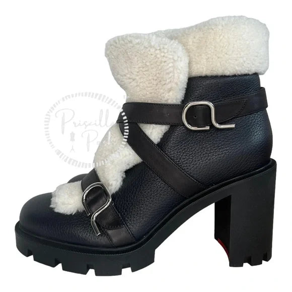 NWB Christian Louboutin Fur Lined Black Leather Pole Chic Shearling Red Sole Combat Booties, Black