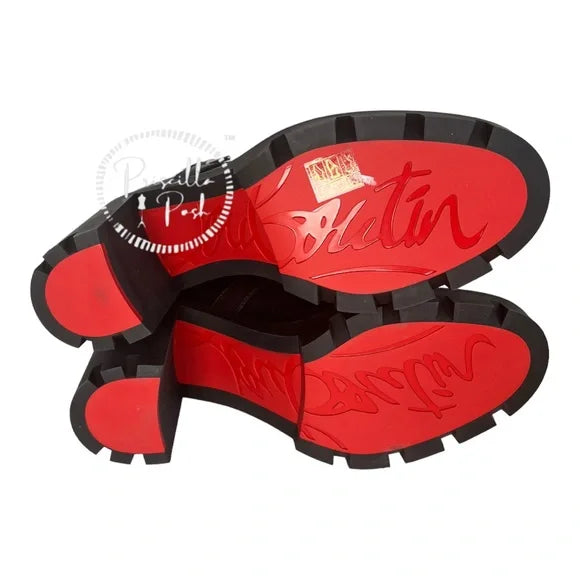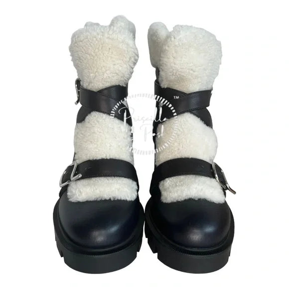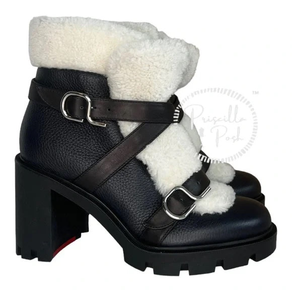 NWB Christian Louboutin Pole Chic Shearling Red Sole Combat Booties, Black 41