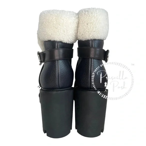 Christian Louboutin "Pole Chic" leather combat booties with dyed shearling (Italy) trim. 3" block heel.