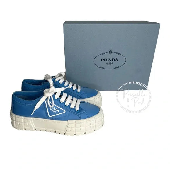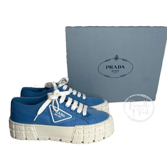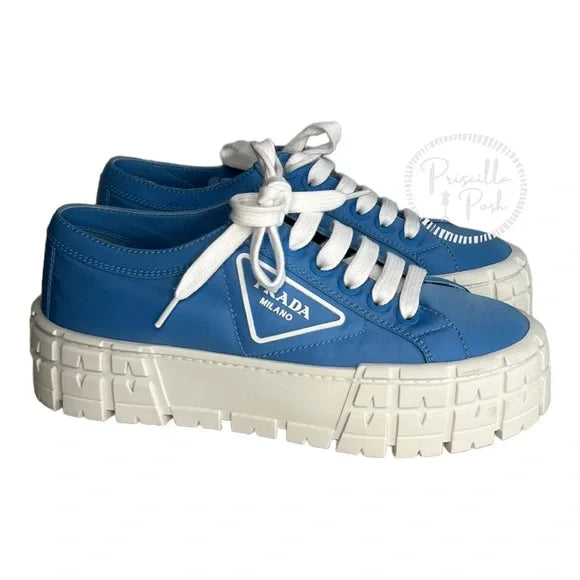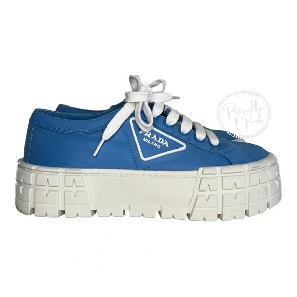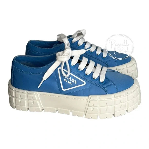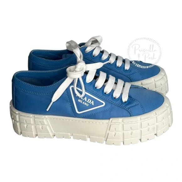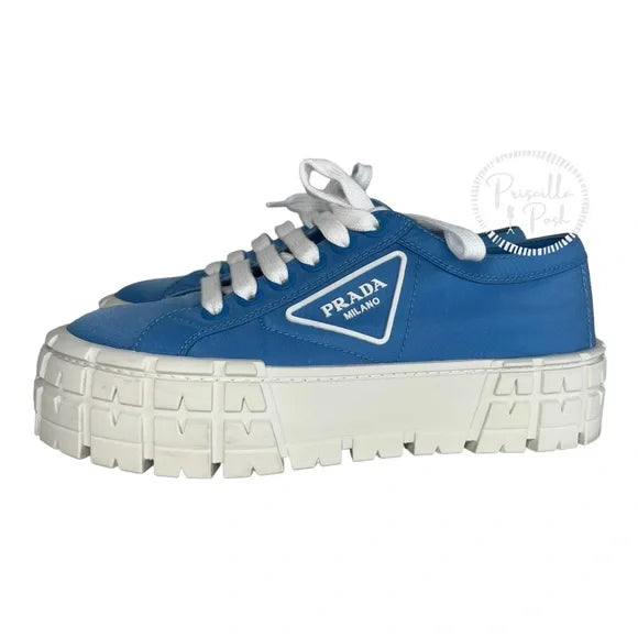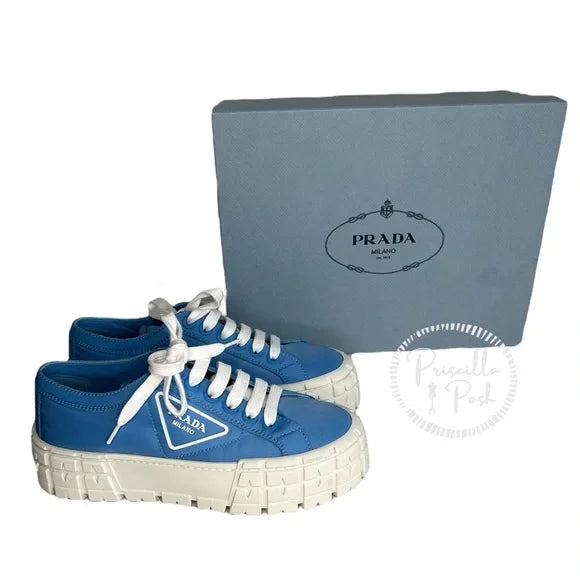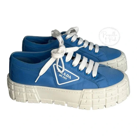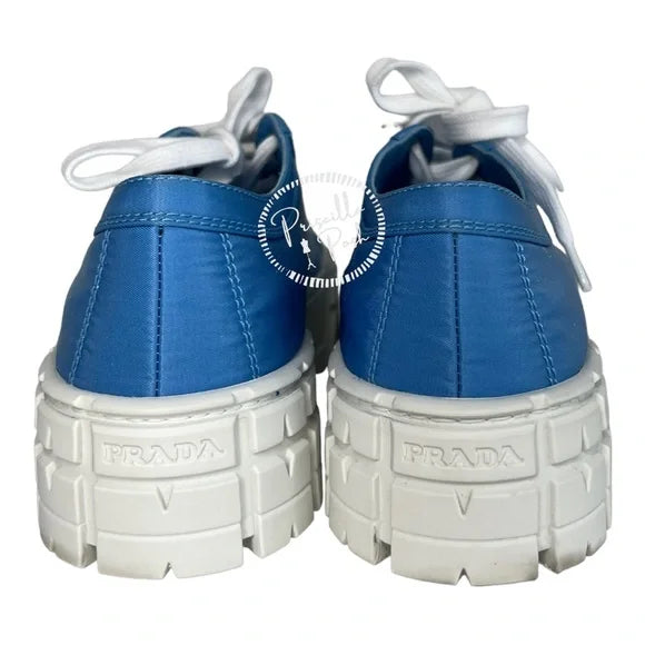 Prada Womens Lace Up Nylon Triangle Logo Platform Sneakers Blue White