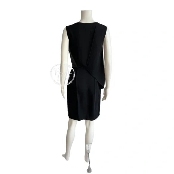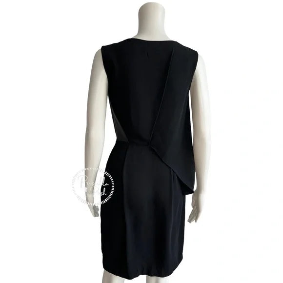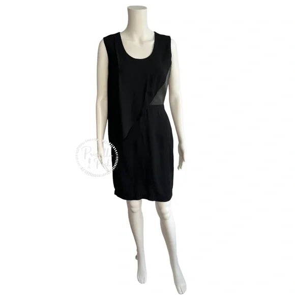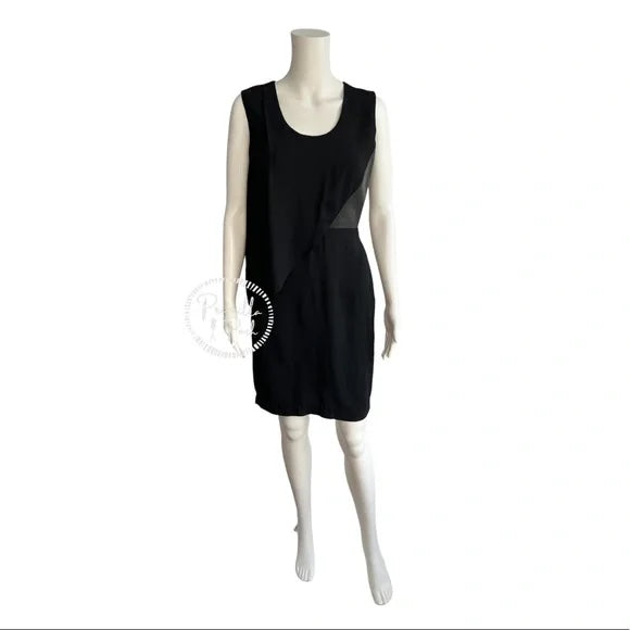 Draped Dress with Leather Bodice by Alexander Wang. Sleeveless boatneck dress with asymmetrical draped top & leather bodice. Boatneck / Sleeveless / Asymmetrical draping over top front & back / Leather bodice with seam details at waist, back & chest / Concealed side zip closure / Fully lined / Length hits at the knee / Straight fit / Color: Black / 71% Triacetate, 29% Polyester / Contrast: 100% Leather / Lining: 97% Silk, 3% Spandex.