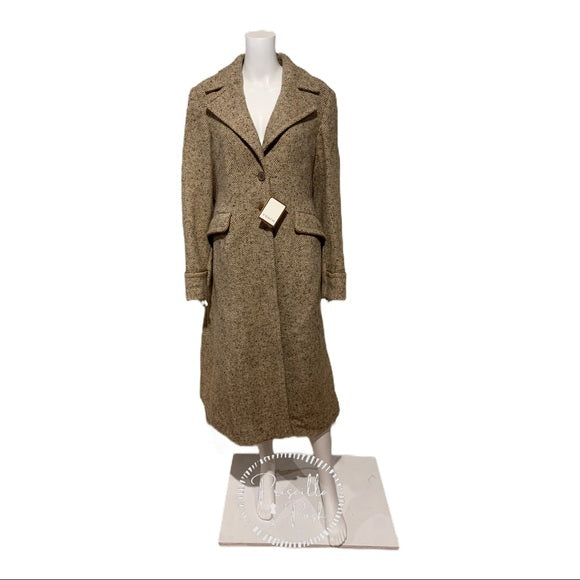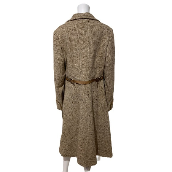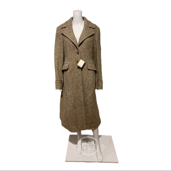 NWT COACH Wool Single Breasted Long Peacoat Brown Beige Herringbone Trench Leather Trim