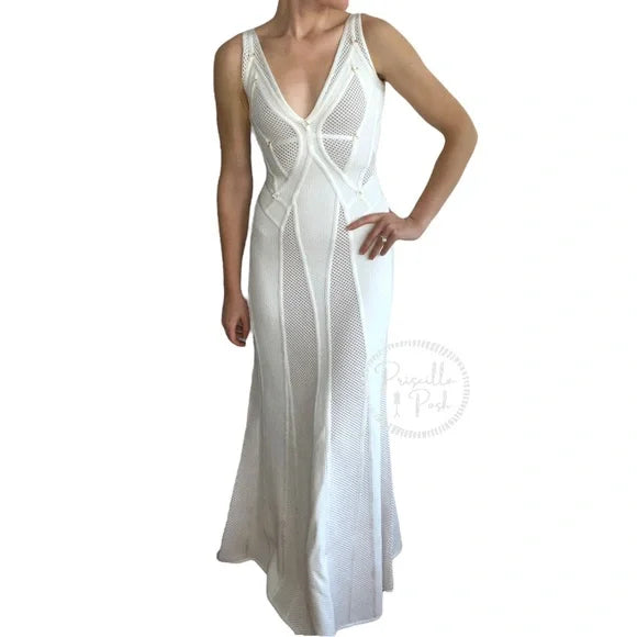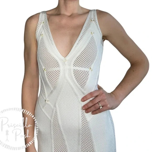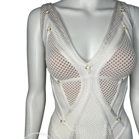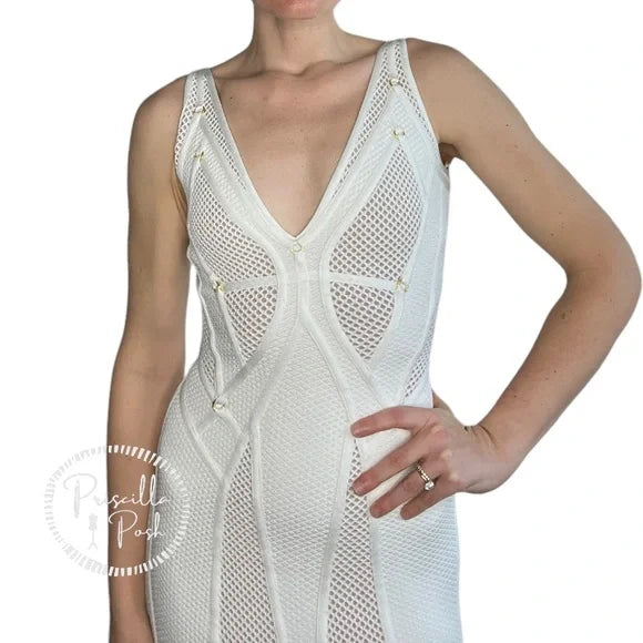 White Herve Leger Lena mesh sleeveless maxi evening dress with V- neck, gold-tone embellished throughout, strap accent throughout, flared hem and concealed zip closure at back.