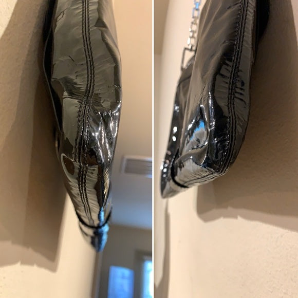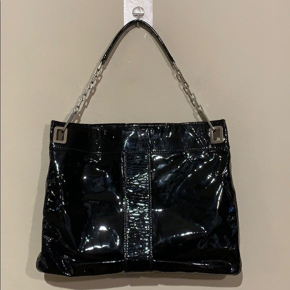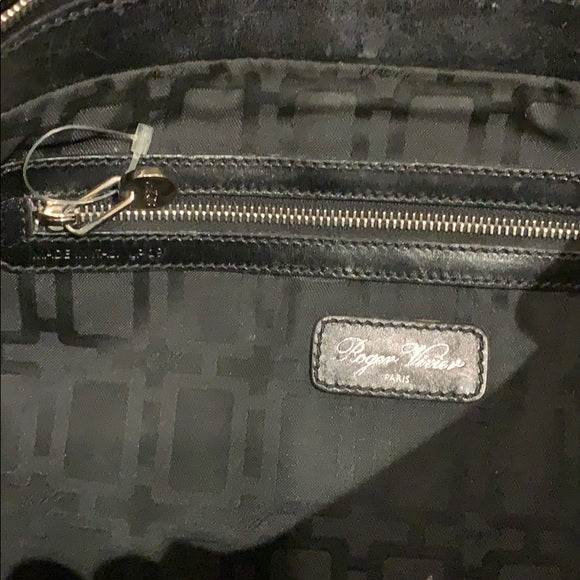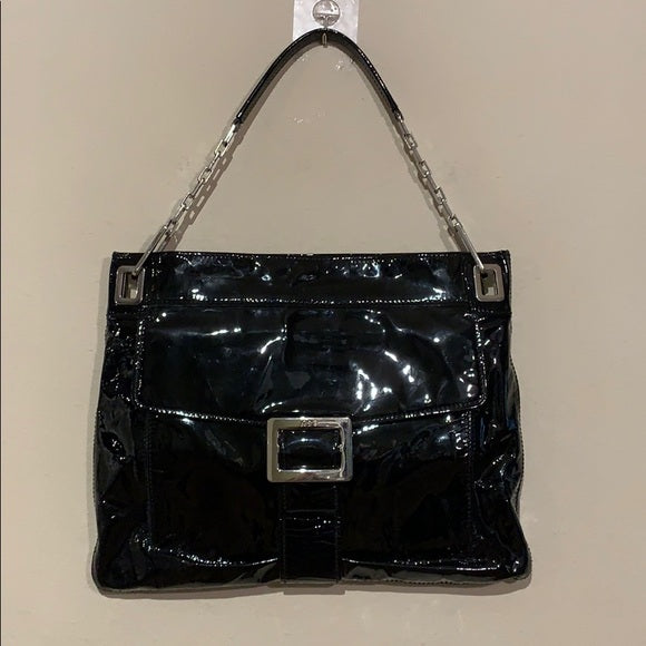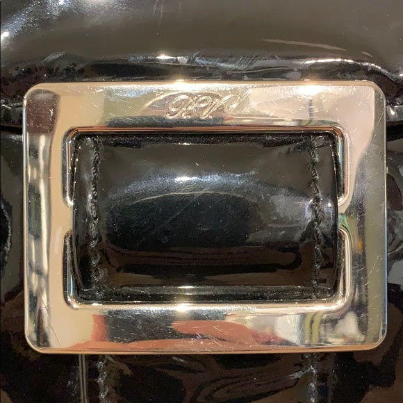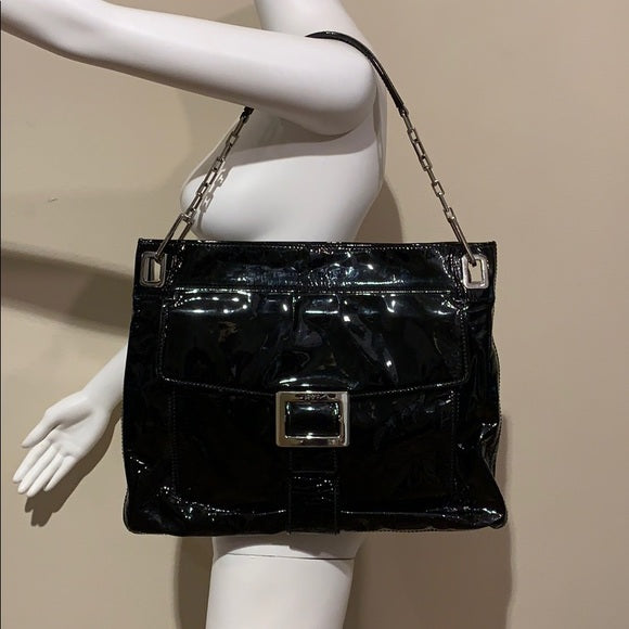 Roger Vivier 'Metro' Shoulder Bag in black patent leather with silver metal hardware.