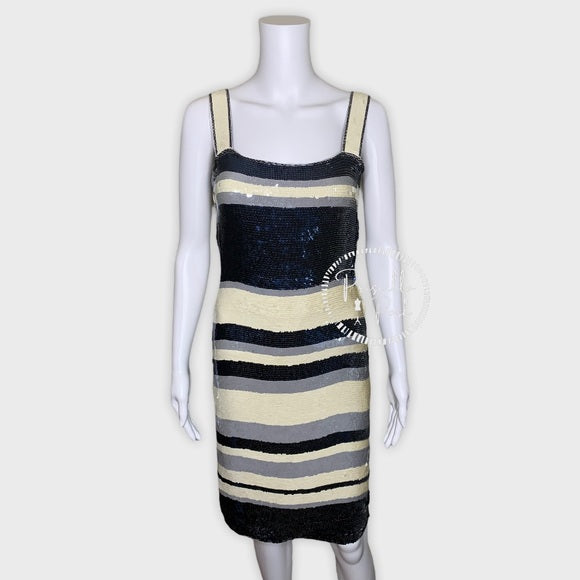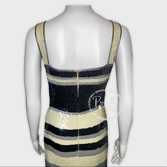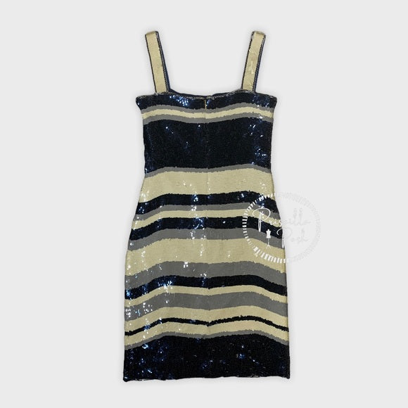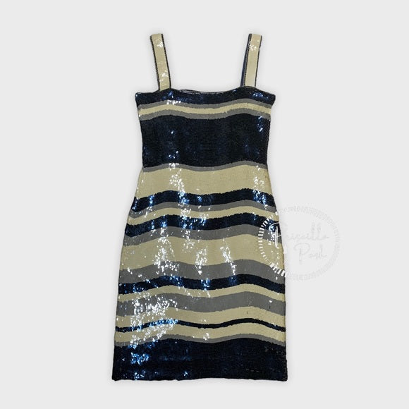 The sequined Edna Dress is a high-glamour, high-gloss take on wavy high-seas stripes. French sailor meets Twenties deco in this shimmering tank. Mesh sequins with rayon grosgrain ribbon under the straps.